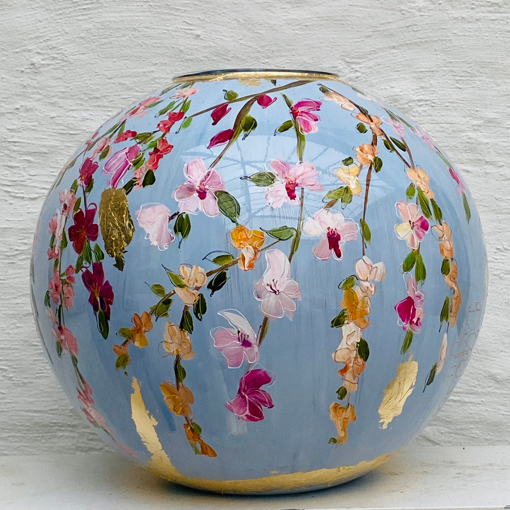 Een editie van 5 vazen, exclusief voor DE BORGHT ontworpen in lichtblauwe kleur met lentebloesem afgewerkt met een vleugje goud. Elke vaas is mondgeblazen en wordt met een speciaal ontworpen binnenvaas geleverd, ideaal voor het plaatsen van verse bloemen.