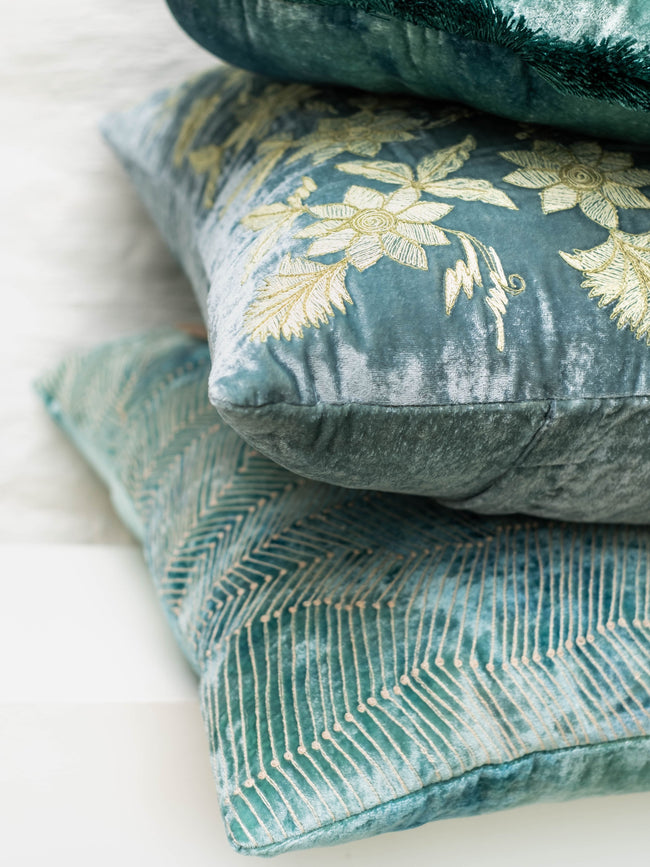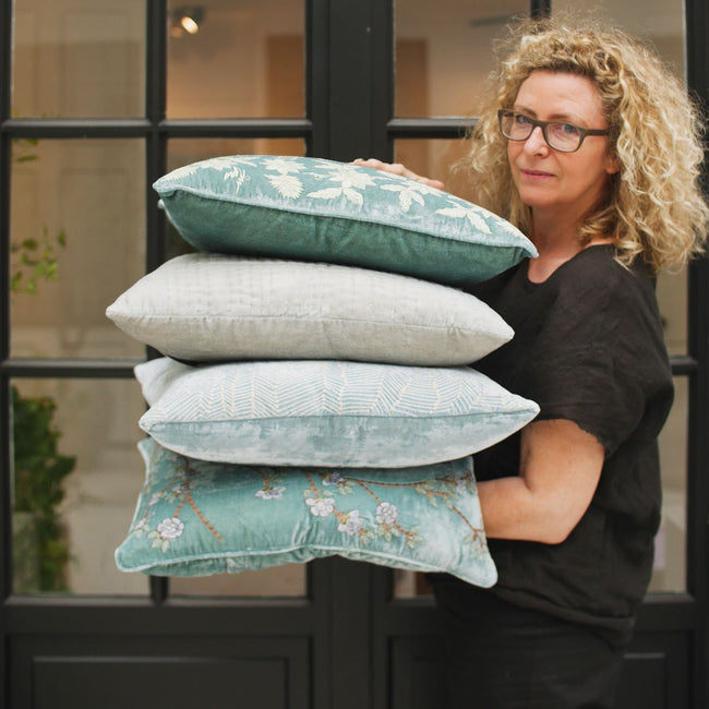 Kussen Ariel - Powder Blue Afmeting: 50x50cm 100% zijdefluweel Handgeborduurd Anke Drechsel is een Duitse textielontwerper en internationaal erkend merk, opgericht in 1986 en bekend om exclusief handgeborduurd huishoudtextiel en accessoires....