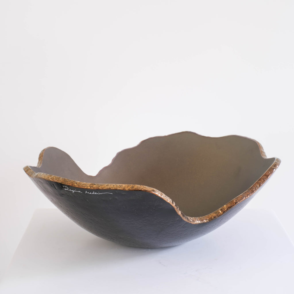 Mapa is een verfijnde glazen schaal van Regina Medeiros, een Braziliaanse glaskunstenaar die uitzonderlijke glasobjecten produceert. Ze beheerst als geen ander glasgiet- en schildertechnieken en gebruikt lokale oxiden en goud componenten om unieke effecten in glas te creëren.
